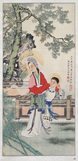 Our Lady and the Boy JesusOUR LADY AND THE BOY JESUS (Modelled on paintings of women leaning on the shoulder of their maid servants) – Silk – Peking, Kuang-an Gate Department of Art, Sacred Heart Church / Luke Hua Hsiao-hsien. Description: scroll watercolor on silk