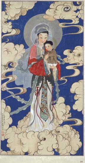 Our Lady Carrying the Child Amidst the CloudsOUR LADY CARRYING THE CHILD AMIDST THE CLOUDS – Silk – Peking, 1947 / John Lu Hung-nien Description: scroll watercolor on silk